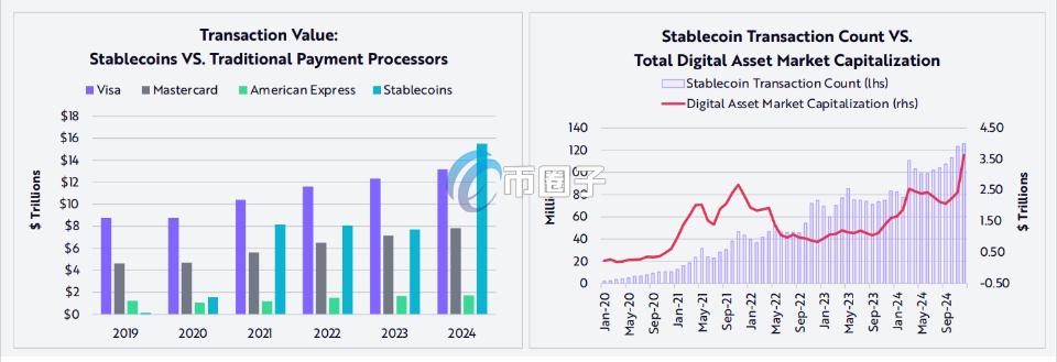 币圈聚合(268btc.cc)讯:方舟投资(ARK Invest)本周在其「BIG IDEAS 2025」最新研究报告中指出,稳定币在2024年收获了巨大的增长,整个稳定币市场在2024年的总交易量达到了15.6兆美元,是传统支付巨头Visa和万事达卡交易量的119%和200%。