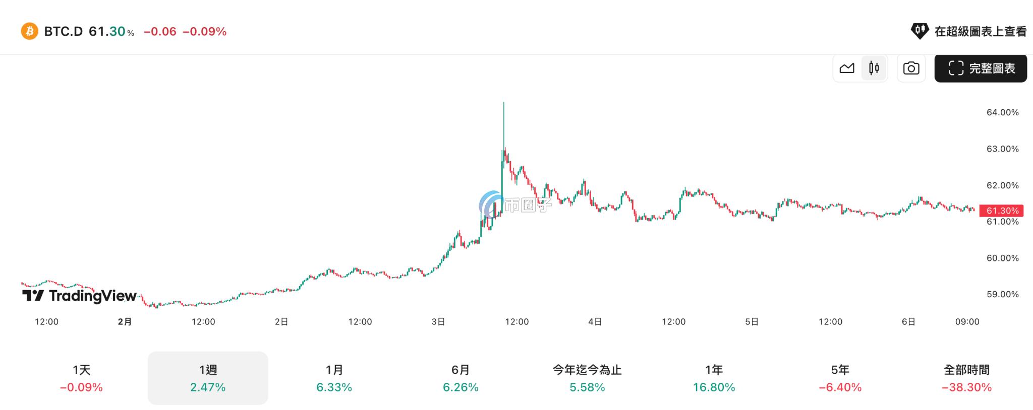 币圈聚合(268btc.cc)讯:本周川普敲响关税战血洗加密货币市场,山寨币周一全线大崩盘,导致比特币主导地位(BTC Dominance)3日一度飙升至64.3%创近四年最高水平,目前回到61.3%上方震荡。