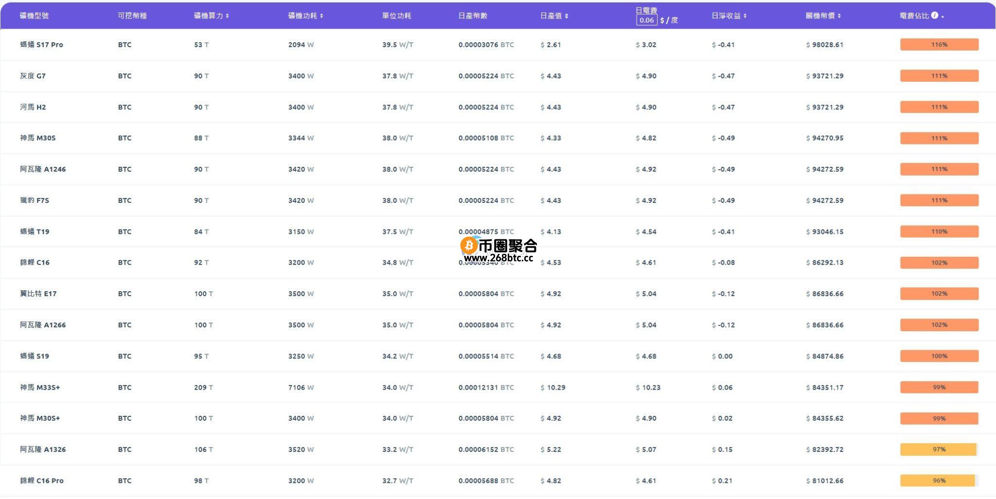 目前仍有盈利空间的67款矿机中,有16款矿机的电费占比已超过60%,其中,神马M33 S+、神马M30 S+的电费占比高达99%,蚂蚁S19的电费占比则达到100%,处于盈亏平衡点。