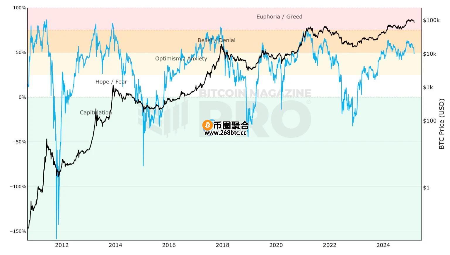 彩虹图从顶部到底部被分为多个颜色,不同的颜色对应着不同的价格范围和市场状态,具体来看是: