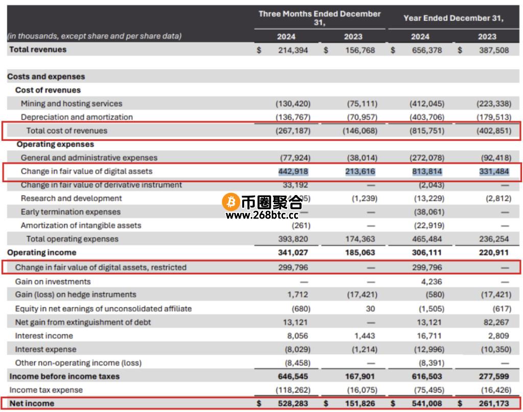 不过,细看其财务报表,在2024年第四季度,公司的净利显著增加,主要原因之一就是数字资产的公允价值变动。根据报告,公司在第四季度的数字资产(包括比特币应收款)的公允价值收入为7.4亿美元。
