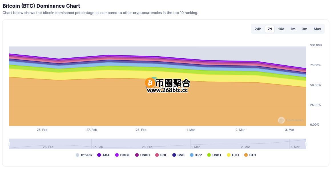 币圈聚合(268btc.cc)讯:美国总统川普(Donald Trump)抛出震撼弹,宣布将瑞波币(XRP)、Solana(SOL)和Cardano(ADA)纳入美国「加密货币战略储备」(Crypto Strategic Reserve)。市场一片欢腾之际,比特币价格一度飙涨10%,但市占率却应声下滑,跌破50%重要关卡。