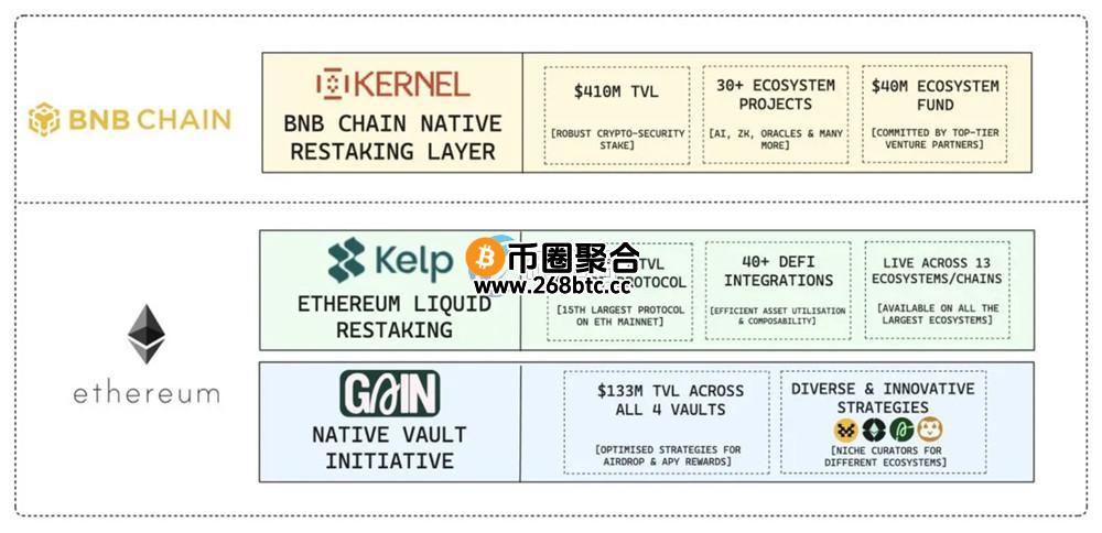 在介绍Kernel之前,读者需要知道的是,整个Kernel DAO生态共有3个主要产品,包括以太坊流动性再质押协议KelpDAO、以太坊空投&收益聚合器GAIN,以及BNB流动性再质押协议Kernel。
