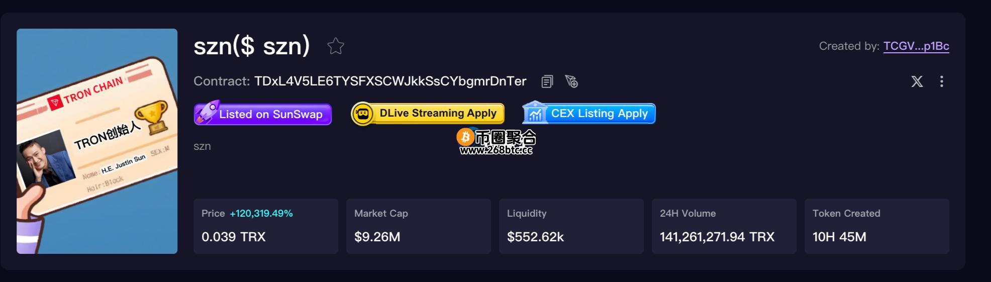 币圈聚合(268btc.cc):波场(TRON)生态meme币发射平台SunPump今(19)一枚新发行的黑马Meme币$SZN爆红,市值在今(19)日上午一度飙破1689万美元,现市值约890万美元,近24小时暴涨超过120,319%,成为该平台今日交易量最高的Meme币。