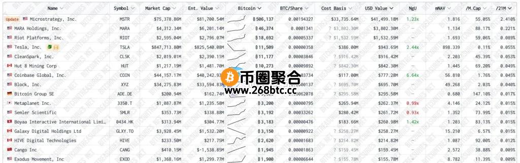 目前根据Bitcoin Treasuries.NET资料,公开上市公司中已有近90间企业持有比特币,其中持有最多比特币的是微策略(MSTR)。从2020年8月首次购买至今,微策略累计已持有超过50万枚比特币,股价也自首次投资比特币以来上涨幅度超过2000%,远超过同期比特币与标普500指数的整体涨幅表现。