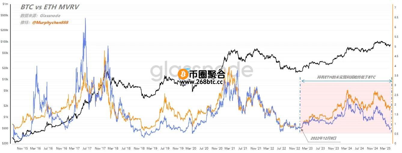 Murphy发现,从2022年12月开始,BTC的MVRV「市场价值与实际价值比率」(蓝线)与ETH的MVRV(黄线)出现了明显分化,在此前长达7年的时间中,这一指标始终都处于交替主导,也就是时而ETH更强,时而BTC更强:现在蓝线始终处于黄线之下,意味着从22年12月以后直到今天,ETH持有者的未实现利润始终都低于BTC。
