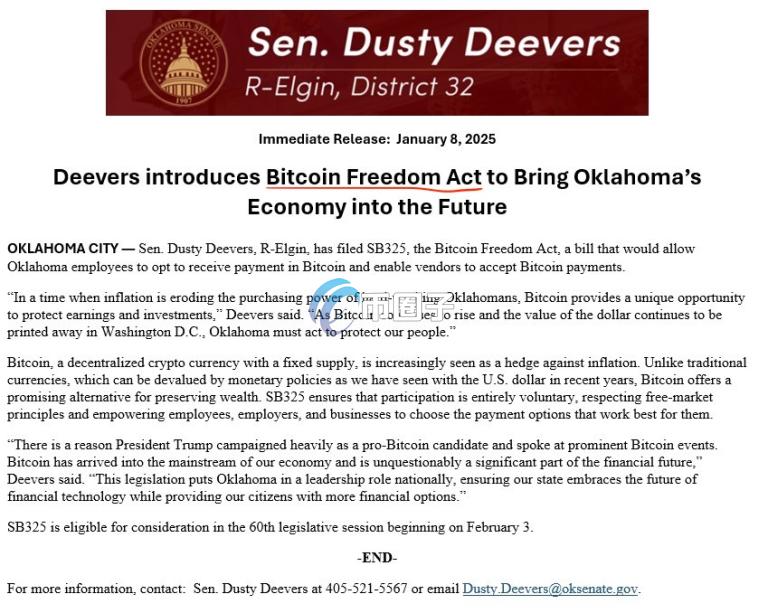 币圈聚合(268BTC.CoM)讯:美国俄克拉何马州参议员Dusty Deevers近日提交了《比特币自由法案(Bitcoin Freedom Act)》,让当地居民及员工能选择以比特币支付薪水,并推动商家接受比特币支付。
