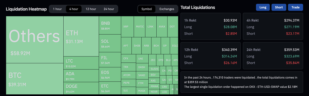 急杀的行情中,让不少投资者亏损,据Coinglass数据显示,光过去1小时内全网爆仓就超过3千万美元,而过去24小时爆仓3.5亿美元。