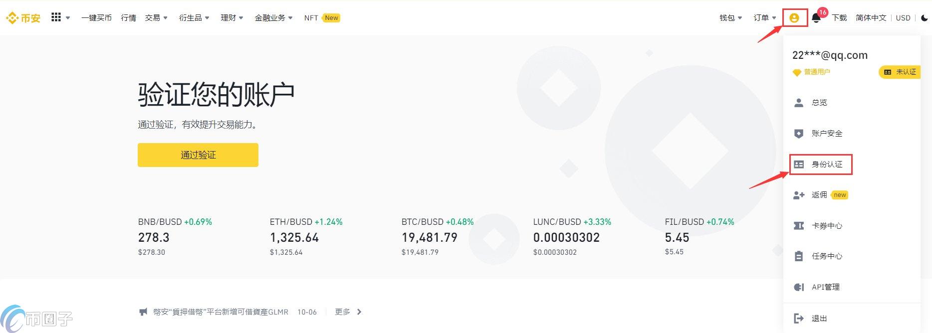 4.登录币安账户,在首页【用户中心】–【身份认证】进行身份认证,在该页面可以查看当前认证级别,它决定了您的账户在币安的交易限额。如需提升额度,请依次完成各个级别的身份认证。