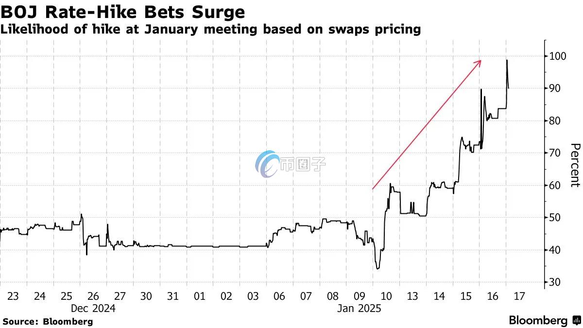 币圈聚合(268btc.cc):据彭博报导,在短短几天内,掉期市场交易员已几乎确信日本央行将在下周升息,周五的隔夜指数掉期显示,日本央行在1月23日至24日的政策会议上升息的可能性高达99%,较周三的71%大幅飙升。