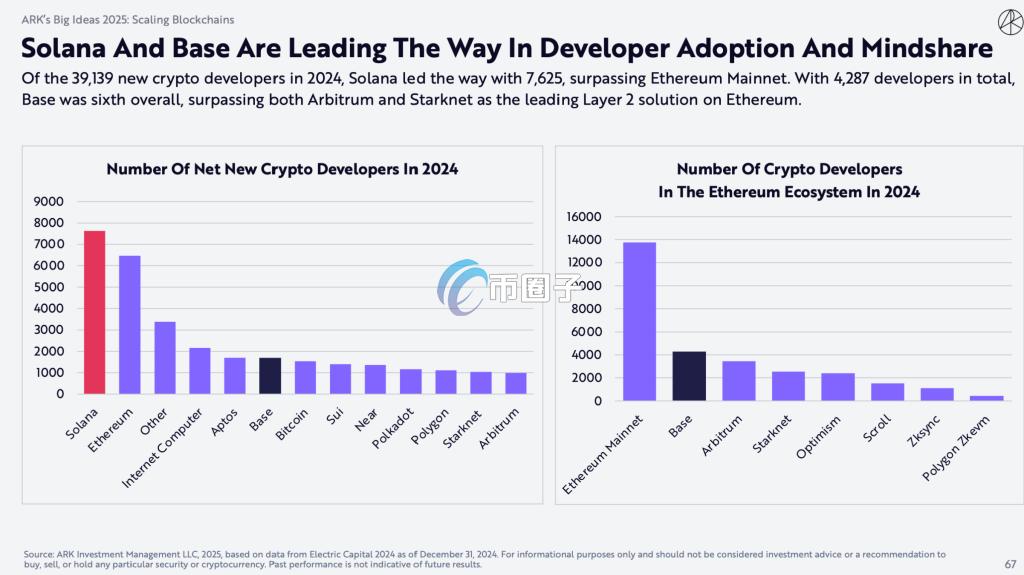 在2024年新增的39,139名加密开发者中,Solana以7,625名开发者领先,超越了以太坊主网。Base则以4,287名开发者排名第六,超越了Arbitrum和Starknet,成为以太坊上最领先的Layer2解决方案。